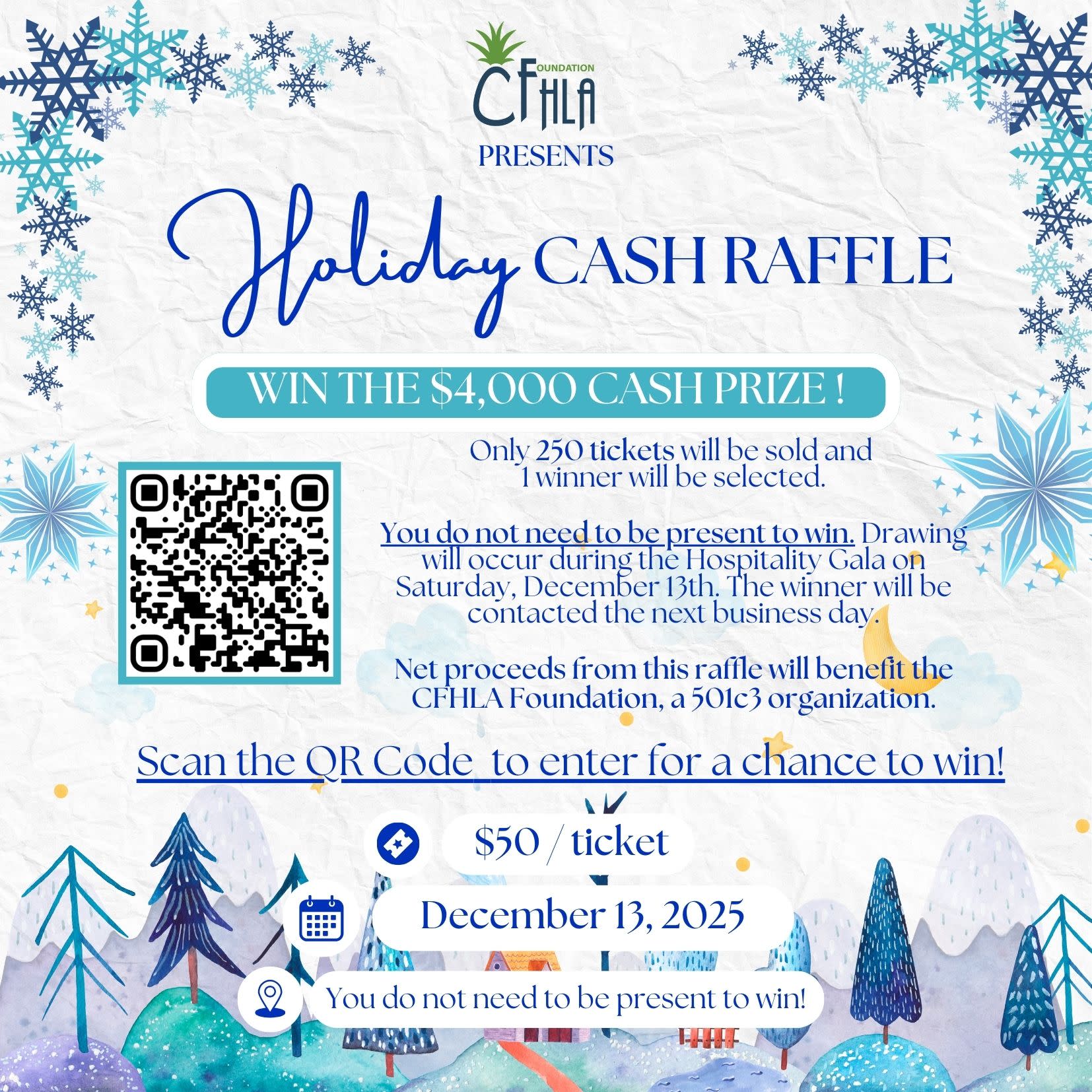 Enter for a chance to win a $4,000 grand cash prize! Only 250 tickets will be sold and 1 winner will be selected. You do not need to be present to win. Drawing will occur at the Hospitality Gala on Saturday, December 13th. The winner will be contacted the next business day. Net proceeds from this raffle will benefit the CFHLA Foundation, a 501c3 organization.